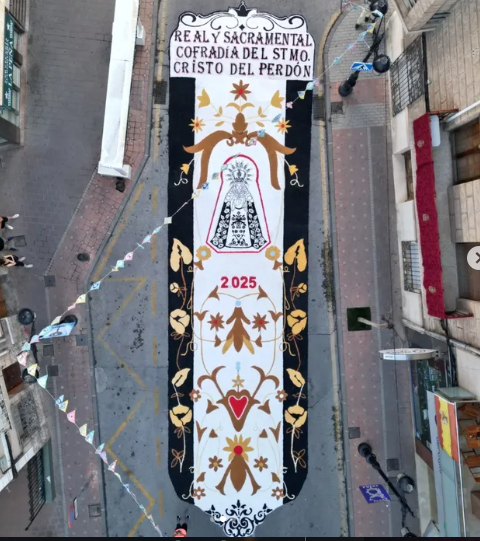 En esta edición, la Real y Sacramental Cofradía del Santísimo Cristo del Perdón participó activamente con la realización de una alfombra de sal cuyo detalle central fue una de las cinco imágenes titulares que posee la cofradía, la Virgen de la Soledad, destacando así su rico patrimonio devocional y artístico. El cuidado en los detalles y la armonía del conjunto llamaron la atención de todos aquellos que pudieron contemplarla.